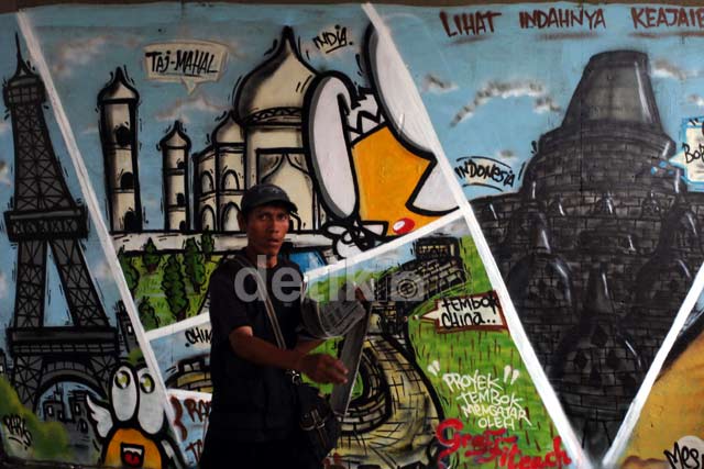 Seorang warga melintas di depan mural di flyover Slipi. Selain meminta pengecatan, Jokowi juga akan meminta tambahan tanaman. Salah satunya di median jalan tol, sehingga jalan bisa lebih hijau. mbudhy/Detikcom.