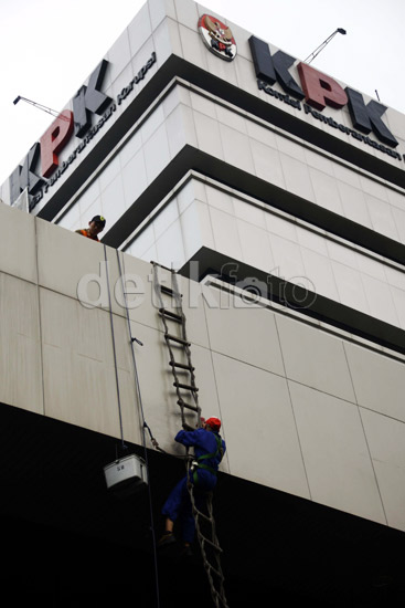 - Sejumlah pekerja membersihkan Gedung KPK di JL Rasuna Said, Jakarta, Rabu (17/4/2013). Kegiatan tersebut dilakukan agar gedung KPK tetap bersih.