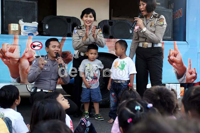 Jakarta - Anak-anak usia dini, mendapatkan edukasi mengenai pengetahuan berlalulintas dan fungsi rambu-rambu lalulintas dijalan, yang dijelaskan oleh sejumlah petugas polisi, di Bunderan Hotel Indonesia, Jalan MH Thamrin, Jakarta, Minggu (19/05).
