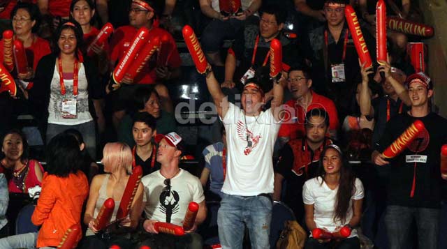 Jakarta - Sejumlah selebriti Ibukota beramai-ramai dari atas tribun bersama para penonton lainnya mendukung penuh saat pertandingan pasangan ganda putra Indonesia, Mohammad Ahsan dan Hendra Setiawan melawan pasangan asal Korea Selatan, di Istora Senayan, Jakarta, Minggu (16/06).