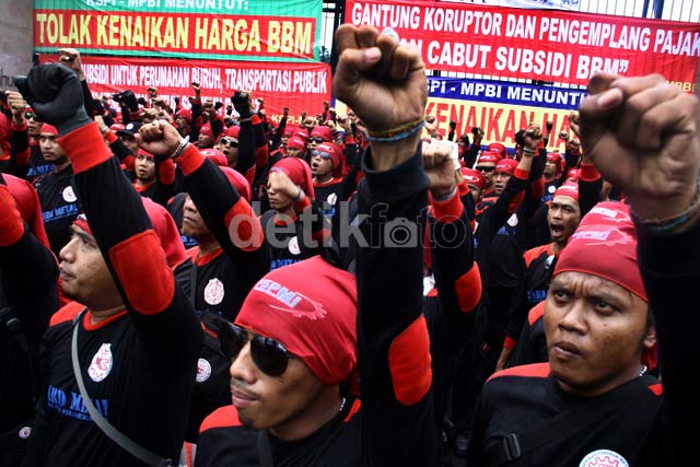 Jakarta - Para buruh yang tergabung dalam beberapa serikat pekerja mulai memenuhi depan pintu gerbang DPR/MPR. Para buruh yang berpakaian hitam dengan tutup kepala merah dan seragam biru itu menolak kenaikan harga BBM.