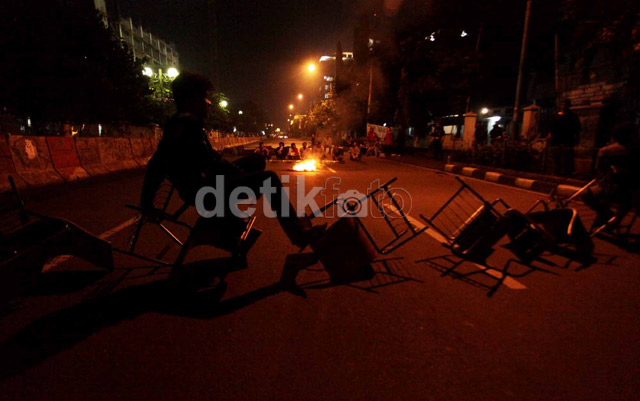 Jakarta - Puluhan mahasiswa UKI, YAI dan UBK berdemontrasi menolak rencana kenaikan harga BBM dengan memblokade jalan Diponegoro, Salemba Jakarta Pusat, Senin (17/6/2013). Hingga pukul 20.45 WIB, mereka masih menutup jalan dan sempat menyisakan satu lajur.