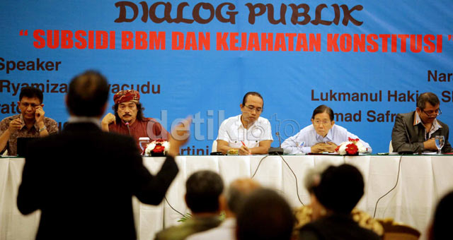 - Para pembicara memaparkan pandanganya terkait dampak kenaikan harga Bahan Bakar Minyak (BBM) di Balai Kartini, Jakarta, Jumat (28/6/2013). Menurut salah satu pembicara yakni ekonom Kwik Kian Gie, pemerintah seharusnya lebih jujur dan transparan terkait kenaikan harba BBM tersebut.