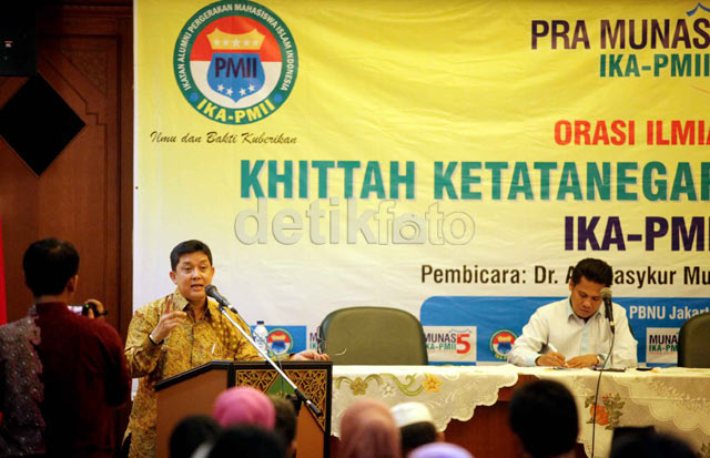 - Anggota Badan Pemeriksa Keuangan (BPK) yang juga Ketua Ikatan Sarjana NU (ISNU) Ali Masykur Musa (AMM) membawakan pidato 'Khittah Ketatanegaraan Indonesia' di Gedung PBNU, Jakarta, Jumat (28/6/2013). Dalam pidatonya, AMM mengkritik cara-cara menyelenggarakan negara yang sebatas formalitas saja.