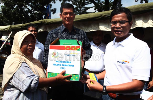 - Bank Mandiri menjual 2.500 paket sembako murah kepada keluarga besar Paspampers dan warga sekitar Markas Paspamres di Jakarta, Sabtu (29/6/2013). Penjualan paket sembako murah ini dalam rangka menyambut bulan suci Ramadan.