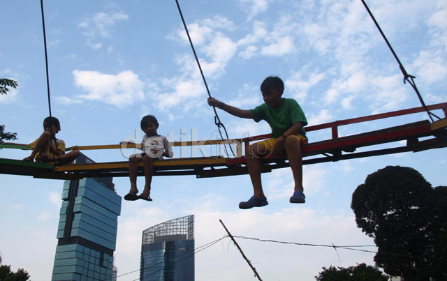 - Sejumlah bocah menikmati permainan komidi ombak di sebuah tanah lapang di Jakarta, Jumat (02/08/2013). Komidi ombak ini menjadi hiburan warga saat menjelang berbuka puasa.