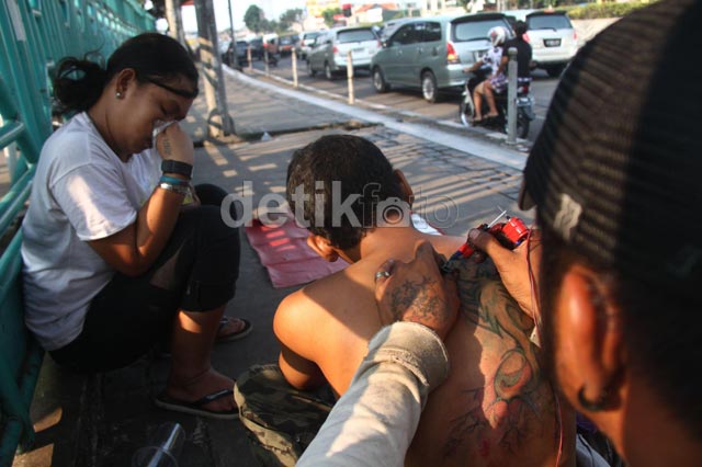 - Seorang Tato Artis jalanan sedang membuat tato permanen pada seorang pelanggannya di kawasan Senen, Jakarta Pusat, Sabtu (03/08). Lokasi serta peralatan tato yang tidak steril saat mentatto, dapat menyebabkan infeksi kulit hingga terkena HIV Aids. Oleh karena jika ingin membuat tato buatlah studio tato yang menggunakan peralatan steril.
