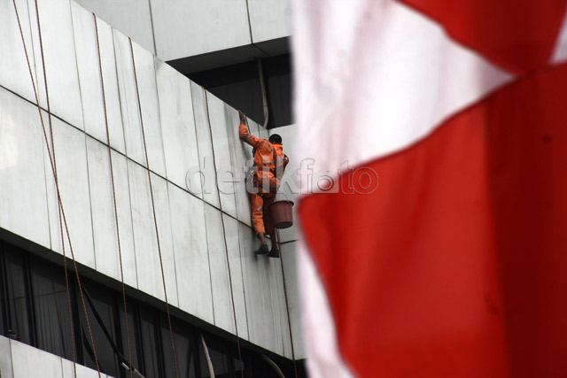 Jakarta - Sejumlah pekerja membersihkan dan pemasang umbul-umbul merah putih di Kementerian Perhubungan, Jl Merdeka Barat, Jakarta Pusat, Senin (5/8/2031). Pemasangan itu untuk menyambut HUT ke-68 RI yang bertema "Mari Kita Jaga Stabilitas Politik dan Pertumbuhan Ekonomi Kita Guna Meningkatkan Kesejahteraan Rakyat".