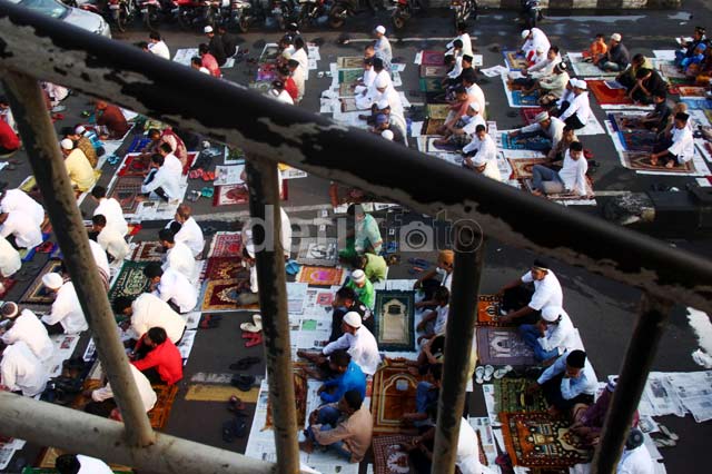 - Ribuan umat muslim mengikuti salat Idul Fitri di kawasan Proyek Pasar Senen, Jakarta Pusat, Kamis (08/08/2013). Daerah ini merupakan daerah langganan bagi warga Senen dan sekitarnya untuk menggelar salat Idul Fitri.