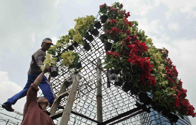 Jakarta - Petugas dari Dinas Pertamanan dan Pemakaman mengganti baru bunga di median jalan Thamrin, Jakarta, Senin (12/8/2013). Bunga dipilih yang berwarna merah dan putih guna menyambut HUT RI ke 68. Penyegaran bunga ini dilakukan di 4 titik yakni kawasan Sudirman dan Rasuna Said.