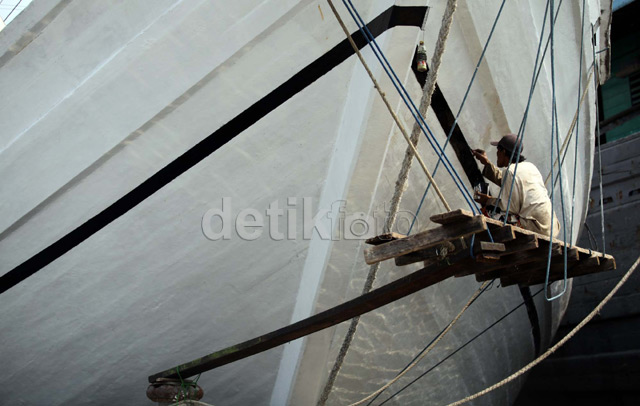 - Meski aktivitas bongkar muat di pelabuhan Sunda Kelapa, Jakarta Utara belum berjalan normal, Selasa (13/8/2013) para pemilik dan anak buah kapal tetap menjalani aktivitas seperti perawatan kapal angkut mereka masing-masing. Salah satunya di kapal Mega Nirwana yang biasa mengakut semen dan kebutuhan logistik lainnya menuju Pontianak, tampak sedang di Cat ulang.
