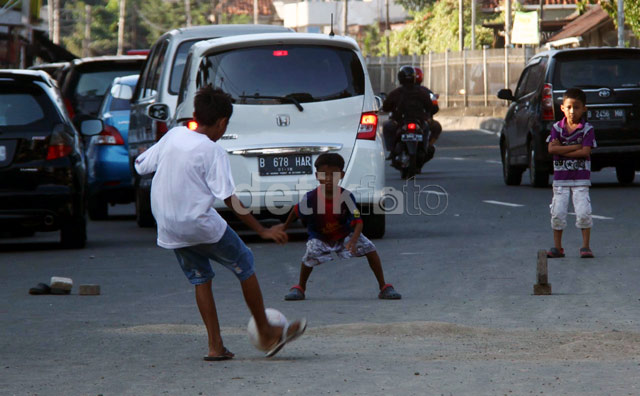 - Sejumlah anak memanfaatkan jalan raya sebagai arena bermain sepakbola. Minimnya lahan di Jakarta menjadi penyebab anak-anak itu bermain di tempat yang berbahaya tersebut.