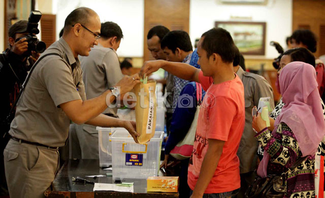 Jakarta - Ratusan calon pedagang Blok G Tanah Abang mengikuti undian yang akan menentukan posisi lapak tempat berdagang, di Kantor Walikota Jakarta Pusat, Senin (19/8/2013). Proses undian yang akan berlangsung satu pekan ini berlangsung tertib.