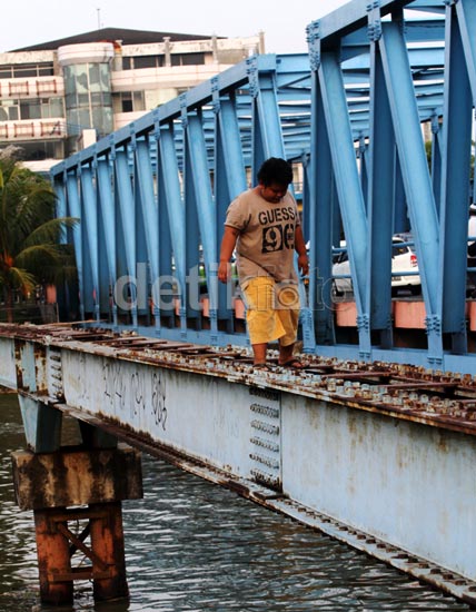 - Seorang bocah menyeberangi Kali Cisadane dengan melewati bekas jembatan, Rabu (21/8/2013). Meski berbahaya, anak tersebut tetap nekat melewati bekas jembatan itu.