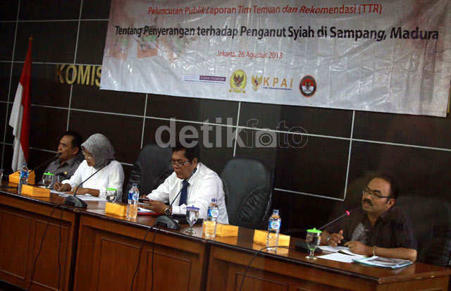 - Tim Temuan dan Rekomendasi (TTR) Komnas HAM meluncurkan hasil temuan dan rekomendasi mereka terkait konflik Sampang. Dalam paparan yang digelar di Kantor Komnas HAM, Jl. Latuharhari, Menteng, Jakarta Pusat, Senin (26/8/2013) ini, TTR merekomendasi 4 hal untuk menyelesaikan permasalahan ini.