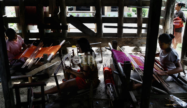 Dengan alat sederhana beberapa orang perempuan Desa Huta Raja, menenun ulos dikolong rumahnya memenuhi pesanan.