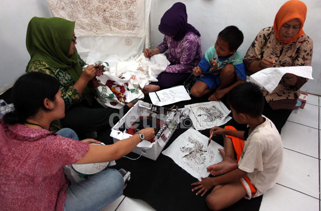 - Sejumlah warga belajar membatik di Palbatu, Tebet, Jakarta Selatan, Rabu (2/10/2013). Acara ini dimaksudkan untuk memeriahkan peringatan hari batik nasional.