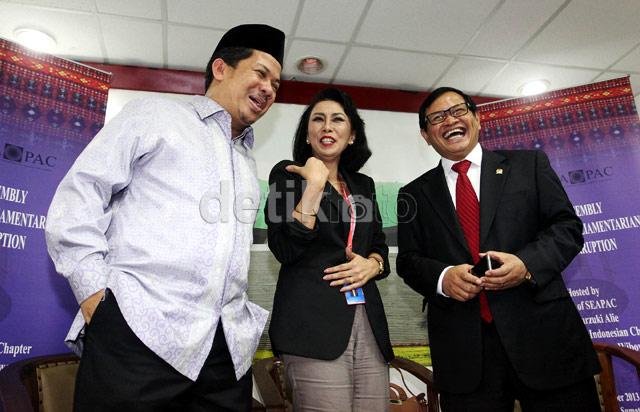 (Kiri ke kanan) anggota Komisi III Fraksi PKS Fahri Hamzah, pakar hukum pidana/pencucian uang Yenti Garnasih, dan Wakil Ketua DPR yang juga Ketua Southeast Asian Parliamentarians Against Corruption (SEAPAC) Pramono Anung menjadi pembicara dalam diskusi tersebut.