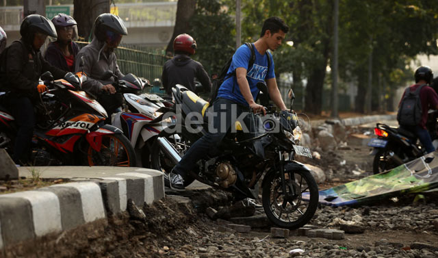 - Jalan di kawasan Grogol, Jakarta Barat, tengah diperbaiki. Meski perbaikan jalan tersebut belum rampung, para pengendara sepeda motor nekat melewatinya guna memutar arah yang lebih dekat.
