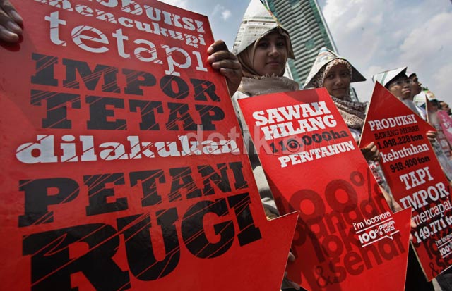 - Massa dari Aliansi untuk Desa Sejahtera berdemo di Bundaran HI, Jakarta, Rabu (16/10). Mereka mengajak masyarakat untuk mendukung peningkatan produksi pangan dalam negeri.