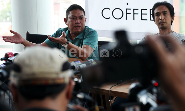 Jakarta - Adiguna Sutowo dan Piyu menggelar keterangan pers seputar kasus perusakan rumahnya di Kafe De HUB Thamrin City, Jakarta Pusat, Senin (28/10). Pengusaha ini mengaku bahwa dialah yang mengamuk di rumahnya sendiri yang dihuni bersama istri keduanya, Vika Dewayani.