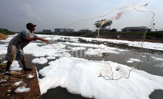 - Sejumlah warga menjaring ikan di Banjir Kanal Timur, Jakarta, Senin (11/11/2013). Meski dipenuhi oleh buih akibat tercemarnya air BKT, mereka tetap mencari ikan untuk kebutuhan konsumsi.