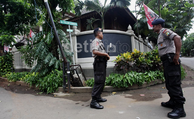- Beberapa personel Polisi bersenjata lengkap terlihat berjaga-jaga di seputar kediaman Anas Urbaningrium di Pondok Kelapa, Jakarta Timur, Selasa (12/11/2013). Penjagaan ini terkait pengeledahan kediaman Anas oleh KPK terkait kasus korupsi pembangunan pusat pendidikan olah raga dan wisma atlet di Hambalang, Sentul, Jawa Barat.