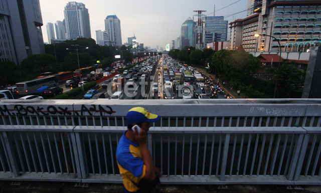 Jakarta - Hujan yang sejak siang mengguyur Jakarta, petang ini telah mereda, Rabu (112/11/2013). Derasnya hujan meninggalkan genangan air di beberapa ruas jalan yang menambah parah kemacetan lalu lintas rutin pada jam padat pulang kantor. Salah satunya di Jl Gatot Subroto, Jakarta.