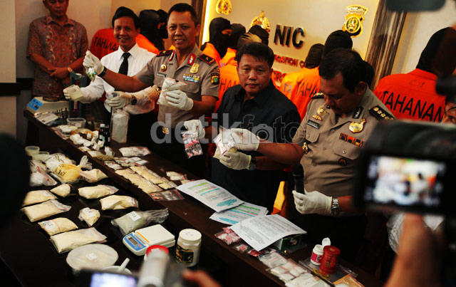 Β Β Β Β Wakapolda Metro Jaya Brigjen (Pol) Sujarno (kedua kiri) didampingi Kabid Humas Polda Metro Jaya Kombes Pol Rikwanto (kanan), Direktur Narkoba Polda Metro Jaya Kombes Nugroho Aji (tengah) menggelar barang bukti di Mapolda Metro Jaya, Senin (18/11/2013).