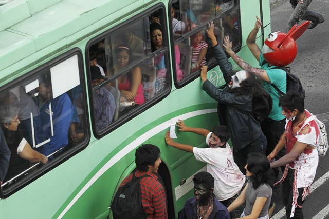 - Ribuan warga Meksiko City berparade di jalan-jalan kota sembari mengenakan busana mayat hidup (zombie) dan wajah yang dipoles dengan dandanan ala mayat hidup zombie, Sabtu (23/11/2012). (Foto-foto: REUTERS/Edgard Garrido)