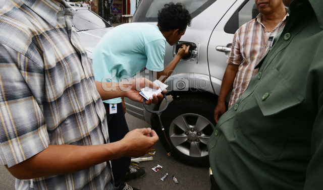 Jakarta - Warga mendatangi SPBU Lubang Buaya, Jakarta Timur untuk memasang Radio Frequency Identification (RFID), Senin (25/11/2013). Radio Frequency Identification adalah alat pengendali konsumsi BBM subsidi.
