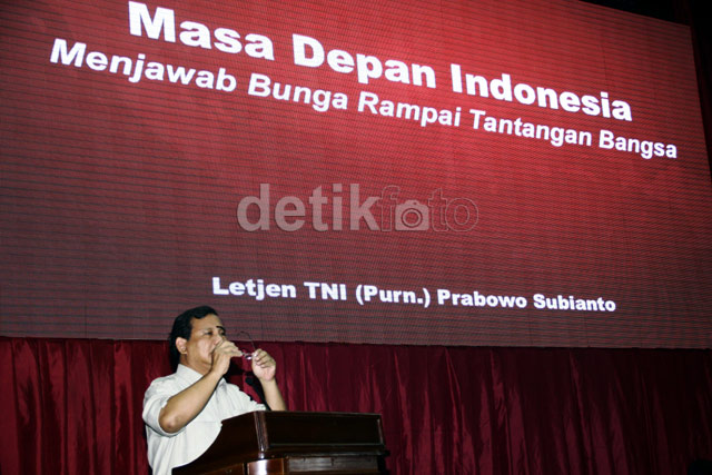 - Prabowo Subianto menghadiri seminar bertema 'Indonesia Menjawab Tantangan' di Aula Fakultas Kedokteran UI, Salemba, Jakarta, Rabu (27/11/2013). Dalam seminar itu, Prabowo mengkritik DPR yang terlalu mudah memberi izin pemekaran daerah baru.
