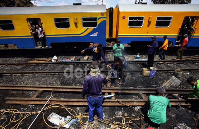 - Pasca tabrakan maut antara KRL versus truk tangki BBM di pintu perlintasan Pondok Betung, Bintaro, petugas dari PT KAI terus memperbaiki jalur yang rusak. Saat ini, kerata api yang bisa melintas baru KA diesel.