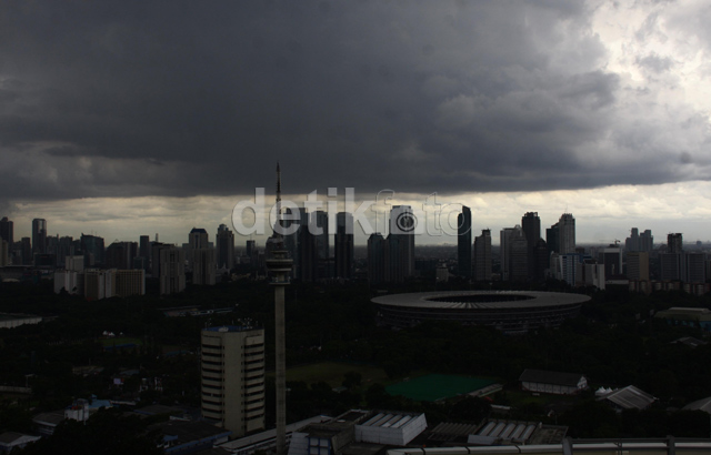 - Awan gelap memayungi kawasan Jakarta Selatan, Jumat (13/12/2013). Gumpalan awan itu juga disertai hujan.
