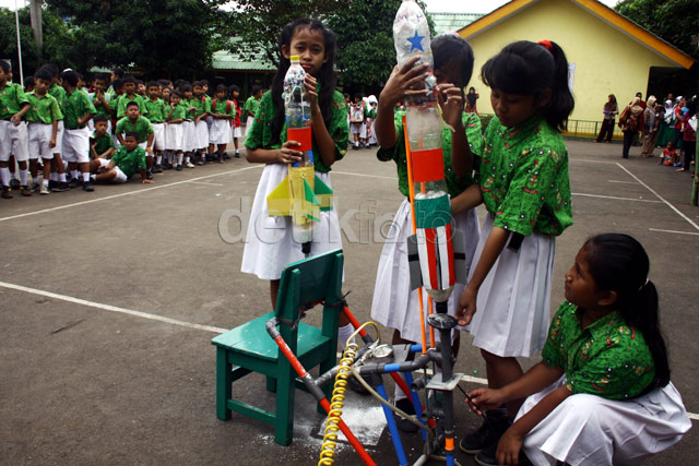 - Siswa SD Kartika X-4, Pesanggrahan, Jakarta Selatan unjuk kebolehan dalam membuat roket air, Kamis (19/12/2013). Roket air tersebut disiapkan untuk ajang Olimpiade Sains Nasional.