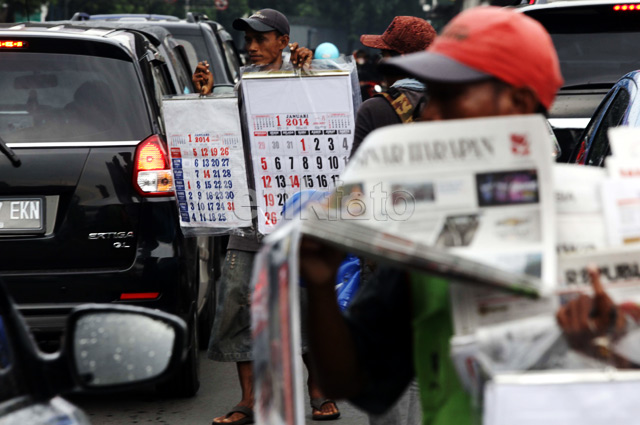 - Jelang pergantian tahun dari 2013 ke 2014 permintaan kalender mengalami peningkatan. Momen tersebut dimanfaatkan oleh pedagang musiman untuk menjajakan kalender, seperti yang terlihat di perempatan Gatot Subroto, Jakarta, Kamis (26/12/2013).