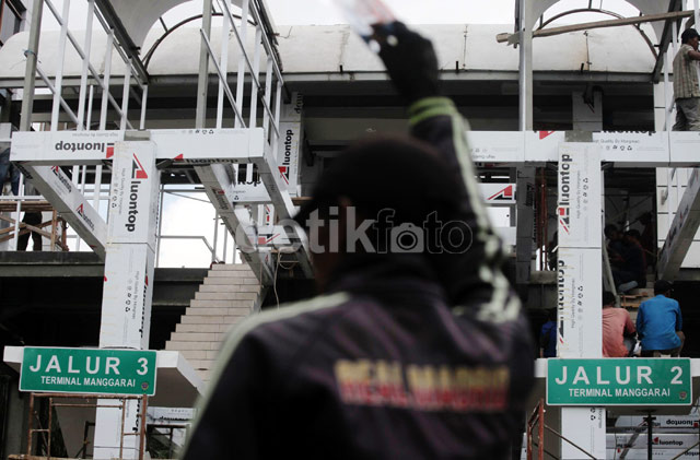 Jakarta - Pekerja menyelesaikan pembangunan Terminal Manggarai, Jakarta, Selasa (07/01/2013). Terminal yang nantinya akan terintegrasi oleh Bus TransJakarta ini seharusnya rampung pada 31 Desember 2013, namun kenyataannya sampai saat ini belum selesai dikerjakan.