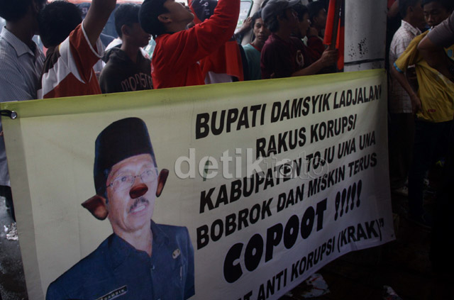 - Puluhan orang yang tergabung dalam Koalisi Rakyat Antikorupsi berdemo di depan Gedung KPK Jalan Rasuna Said, Kuningan, Jakarta Selatan, Rabu (8/1/2014). Mereka meminta KPK menahan Bupati Tojo Una-Una, Sulawesi Tengah, Damsik Ladjalani.