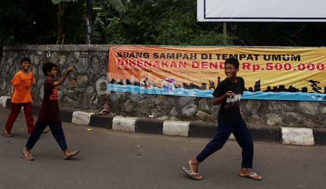 Jakarta - Seorang tukang sampah melintas di depan spanduk tentang larangan membuang sampah sembarangan yang terpasak di kawasan sekitar bandara halim perdana kusumah, Jakarta (10/01/2014). Pemprov DKI resmi memberlakukan denda sebesar Rp. 500.000,- bagi warganya yang kedapatan membuang sampah tidak pada tempatnya.