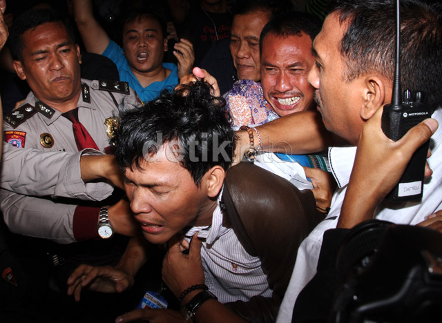 Jakarta - Polisi menangkap seorang pria yang melempar telur ke arah Anas Urbaningrum di gedung KPK, Jakarta, Jumat (10/1/2014). Sebelum diamankan polisi, pria tersebut sempat menjadi bulan-bulanan pendukung Anas.