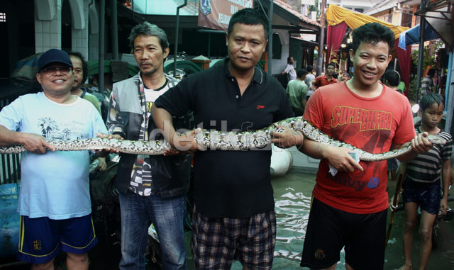- Warga Petogogan menangkap ular piton saat banjir melanda pemukiman mereka, Senin (13/1/2014). Ular ini ditangkap saat sedang memakan seekor ayam.