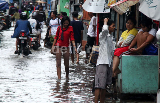 - Warga beraktivitas ditengah banjir yang melanda Kampung Kandang, Kelapa Gading, Jakarta, Jum'at (17/1/2014). Banjir dikawasan ini mencapai 70 cm yang dikarenakan meluapnya kali sunter.