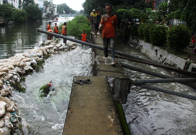 Jakarta - Pekerja berusaha memperbaiki tanggul Kali Sekretaris yang jebol di Tanjung Duren Utara, Jakarta, Minggu (19/1/2014). Debit air yang terus meningkat menjadi penyebab jebolnya tanggul Kali Sekretaris tersebut.