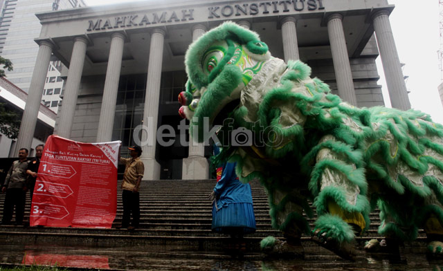 Jakarta - Barongsai dan ondel-ondel beratraksi saat aksi damai di depan Gedung Mahkamah Konstitusi (MK), Jakarta, Selasa (21/01/2014). Mereka menuntut agar pelaksanaan pemilu legislatif dan pemilu presiden dalam waktu yang bersamaan.