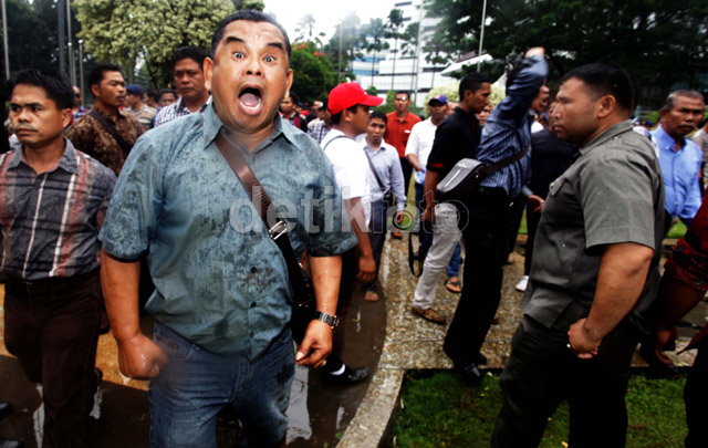 Jakarta - Kericuhan kembali terjadi di gedung Mahkamah Konstitusi, Jakarta, Kamis (23/1/2014). Kericuhan saat sidang sengketa Pilkada Kabupaten Kerinci itu terjadi ketika pendukung dari nomor urut 2 dan 3 memasuki ruang persidangan.