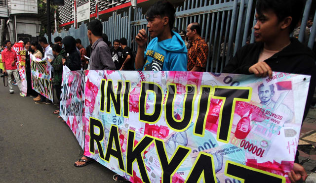 - Puluhan orang berdemo di depan kantor Bawaslu di Jakarta, Senin (3/2/14). Mereka menolak dana saksi partai politik pada Pemilu 2014.