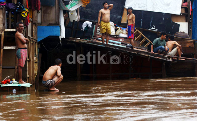 Jakarta - Sebagian warga memilih tetap bertahan di rumah mereka di Kampung Pulo, Jakarta Timur, Selasa (04/02/2014). Para warga ini memilih bertahan di rumah mereka dengan alasan menjaga harta benda milik mereka.