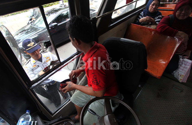 Jakarta - Petugas Gabungan dari Kepolisian dan Dinas Perhubungan melakukan razia kendaraan umum di kawasan lapangan Banteng, Jakarta Pusat, Senin (10/02/2014). Polda Metro Jaya bekerja sama dengan Dishub DKI akan terus melakukan razia angkutan umum agar dapat menciptakan rasa amam dan nyaman bagi para penumpang.