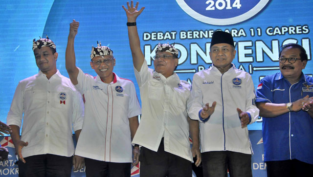 - Debat capres konvensi Partai Demokrat digelar di Grand City Surabaya, Kamis (13/2/2014). Acara debat dimulai pukul 15.20 WIB. Sesi pertama menghadirkan 6 capres, yakni Gita Wirjawan, Haryono Isman, Sarundajang, Pramono Edhie Wibowo, Anies Bawesdan, dan Endriartono Sutarto.