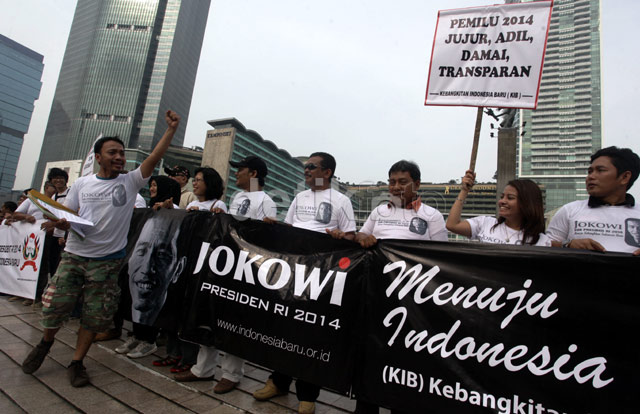 - Puluhan orang yang berasal dari Barisan Relawan Jokowi Presiden 2014 melakukan aksi di kawasan bundaran Hotel Indonesia, Jakarta (16/02/2014). Aksi tersebut untuk mendukung Gubernur DKI Jakarta Joko Widodo maju menjadi Capres 2014, karena mereka meyakini Jokowi telah membawa perubahan.